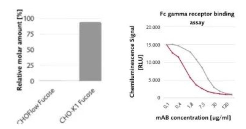 除已有的CHOzen®細(xì)胞系和GLYCOEXPRESS® (GEX®)細(xì)胞系外,漢騰生物新推出的巖藻糖基轉(zhuǎn)移酶8敲除的CHO細(xì)胞系,可賦予重組表達的單抗無巖藻糖修飾的特性。該細(xì)胞系在產(chǎn)量和生長與野生型CHO K1一致的條件下,無巖藻糖抗體與FcγRs抗原親和力提高,ADCC效應(yīng)加強。