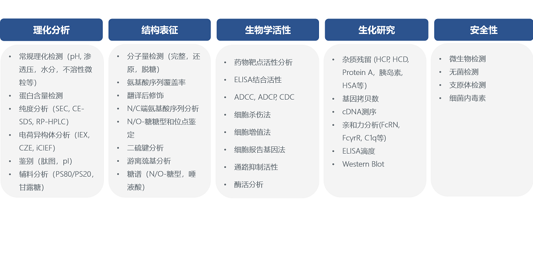 分析方法開發(fā)團隊擁有先進的儀器設(shè)備,具備豐富的單抗,雙抗和重組蛋白等pCQA分析與監(jiān)控的經(jīng)驗,為新藥和仿藥研發(fā)以及IND/BLA申報提供一站式全流程服務(wù),包括: