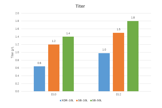 漢騰生物擁有國內(nèi)獨(dú)有的環(huán)軌搖晃式生物反應(yīng)器平臺,該平臺具有低剪切力,高氧傳質(zhì)效率,并具有良好的搖瓶至2500L規(guī)模放大一致性等優(yōu)點(diǎn)。同時由于特殊的培養(yǎng)方式,該平臺適合對剪切力敏感的蛋白生產(chǎn)(包括重組蛋白,雙抗等)。本案例中切換至10L環(huán)軌搖晃式反應(yīng)器(OrbShake SB10-X),相對傳統(tǒng)10L攪拌式反應(yīng)器(XDR-10L),表達(dá)量提升50%;另外,在OrbShake SB10-X放大至OrbShake SB50-X中,單位體積內(nèi)表達(dá)量也提高了20%。