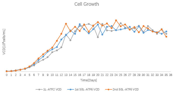 漢騰生物已建立了成熟的灌流工藝平臺,能夠?qū)崿F(xiàn)1L至200L規(guī)模的灌流工藝開發(fā)及生產(chǎn)。本案例中,通過對早期開發(fā)數(shù)據(jù)的分析,順利的在同規(guī)模(1L)實(shí)現(xiàn)工藝重復(fù)及確認(rèn),并成功放大至50L生產(chǎn)規(guī)模,成功幫助客戶完成了灌流工藝項(xiàng)目的引入及生產(chǎn)。