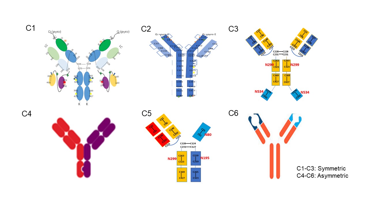首先通過In-silico分析等方法對雙抗進行氨基酸序列分析,提前預測質(zhì)量及結(jié)構(gòu)上的風險點以及關(guān)鍵質(zhì)量參數(shù)等,從分子角度對其穩(wěn)定性及功能進行優(yōu)化設(shè)計,為后續(xù)的工藝開發(fā)(包括表達體系、細胞培養(yǎng)、純化和制劑工藝)提供理論支持。