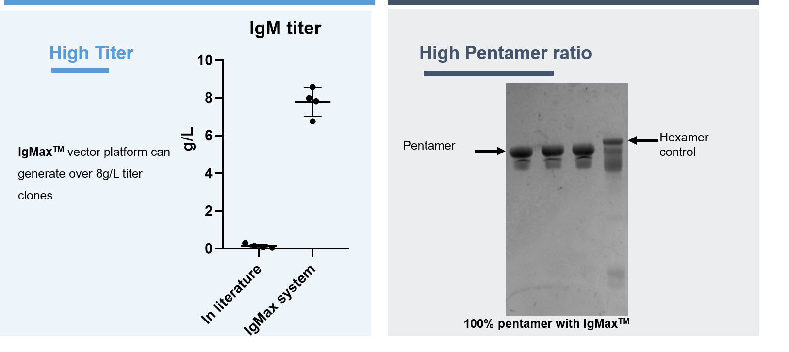 關(guān)于lgM的開發(fā),已有文獻記載其產(chǎn)量非常低。漢騰生物在高表達IgM方面具有豐富經(jīng)驗,IgMax®平臺是漢騰生物自主研發(fā)的平臺,通過特殊設(shè)計的載體系統(tǒng),細胞株產(chǎn)量可達8g/L,并且IgM構(gòu)型均一,五聚體比例100%,無六聚體產(chǎn)生,從源頭避免后續(xù)六聚體難去除風險。