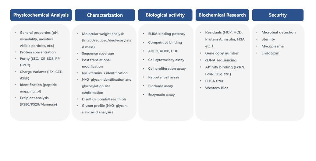The analytical development team has advanced instruments and holds extensive experience in pCQA analysis for monoclonal antibodies, bispecific antibodies, and recombinant proteins. We provide analytical method development for biotherapeutic proteins and one-stop solutions for IND/BLA submission.